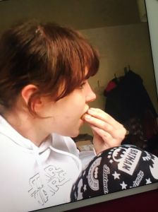 Und jetzt kommt noch ein Bild von gestern – quasi behind the scenes. Zazzles schafft es immer wieder mich beim Essen zu fotografieren. Wir haben darüber gebrainstormt, welche Aufgaben in der Challenge einen Platz finden können und wie viele es denn werden könnten. Darauf erstmal einen Schokocookie.