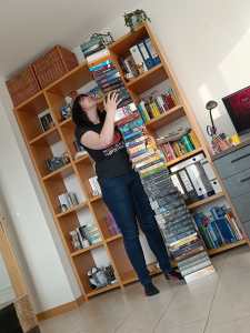 Ach ja, eine Sache gibt es da noch: Mein SuB ist ein wenig gewachsen. Ein wenig sehr viel. Da unsere Bücherregale fusioniert sind, hat meine Community entschieden, dass die Bücher, die im Regal der Schneeflocke standen, die ich noch lesen möchte, auf meinem SuB wandern. Von 7 auf 60 in nur einer Umfrage und einem Umzug, ist ein wenig traurig, aber was solls. Irgendwann ist auch dieser SuB abgearbeitet. Und weil es so schön ist: Hier ein Bild von mir und meinem neuen SuB.
